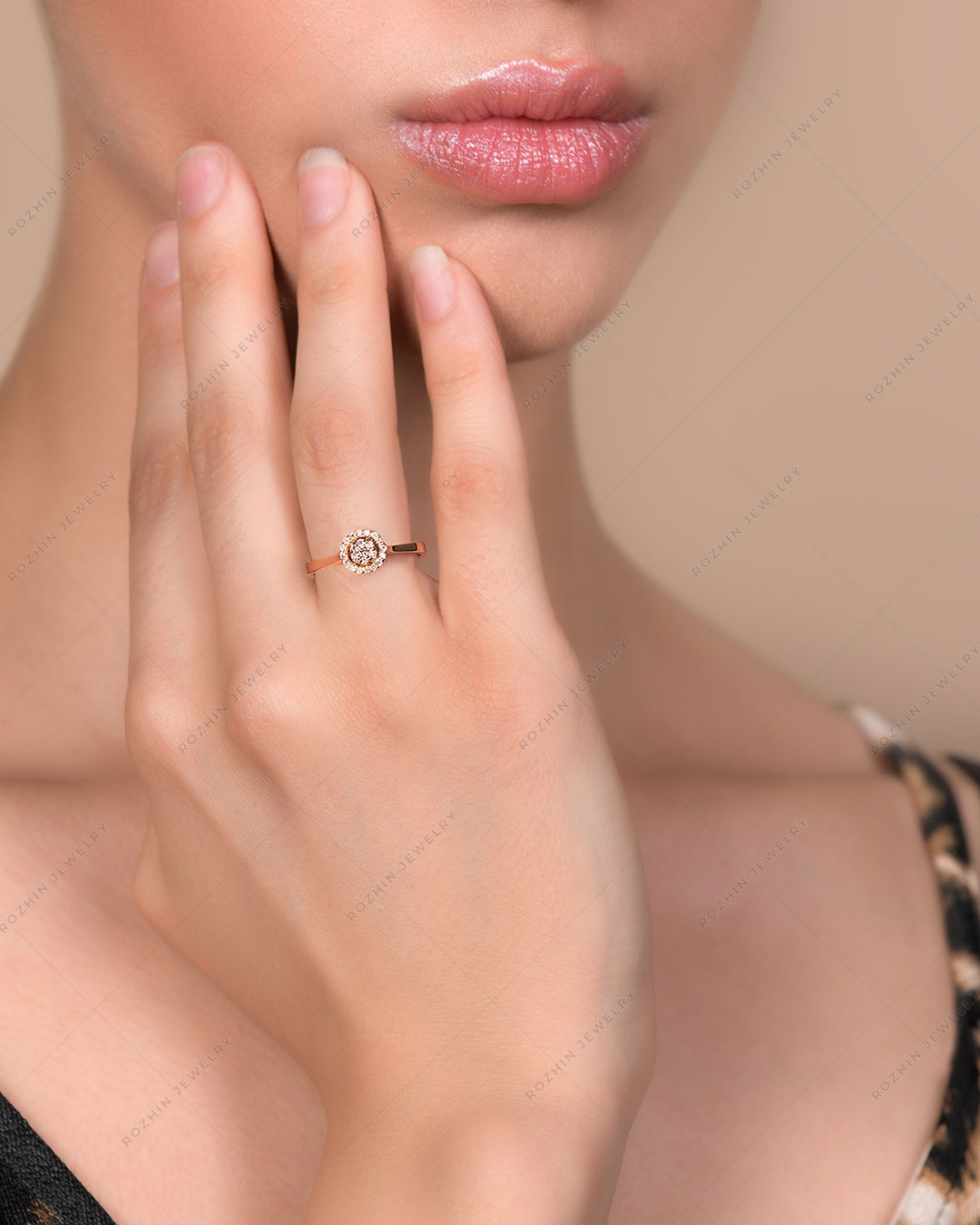 جواهری روژین با طراحی خاص این محصول و با استفاده از یک رج الماس با تراش برلیان به دور فلاور مرکزی باعث شده علاوه بر ظرافت و قیمت مناسب، انگشتر دارای نمای بزرگتر و درخشش بیشتر در دست باشد.