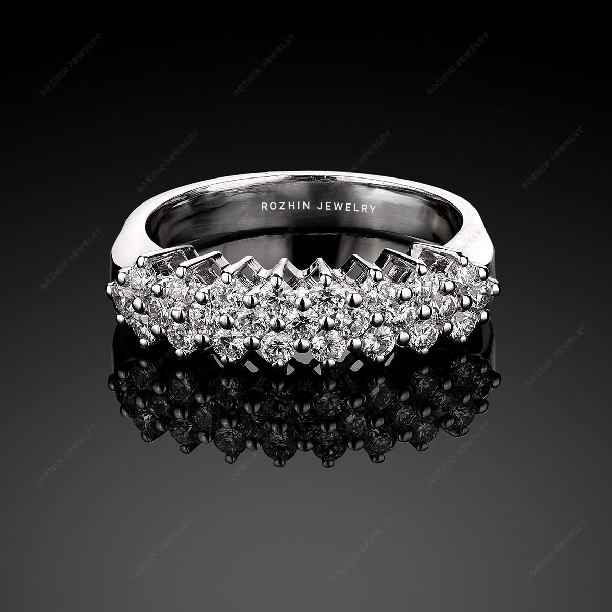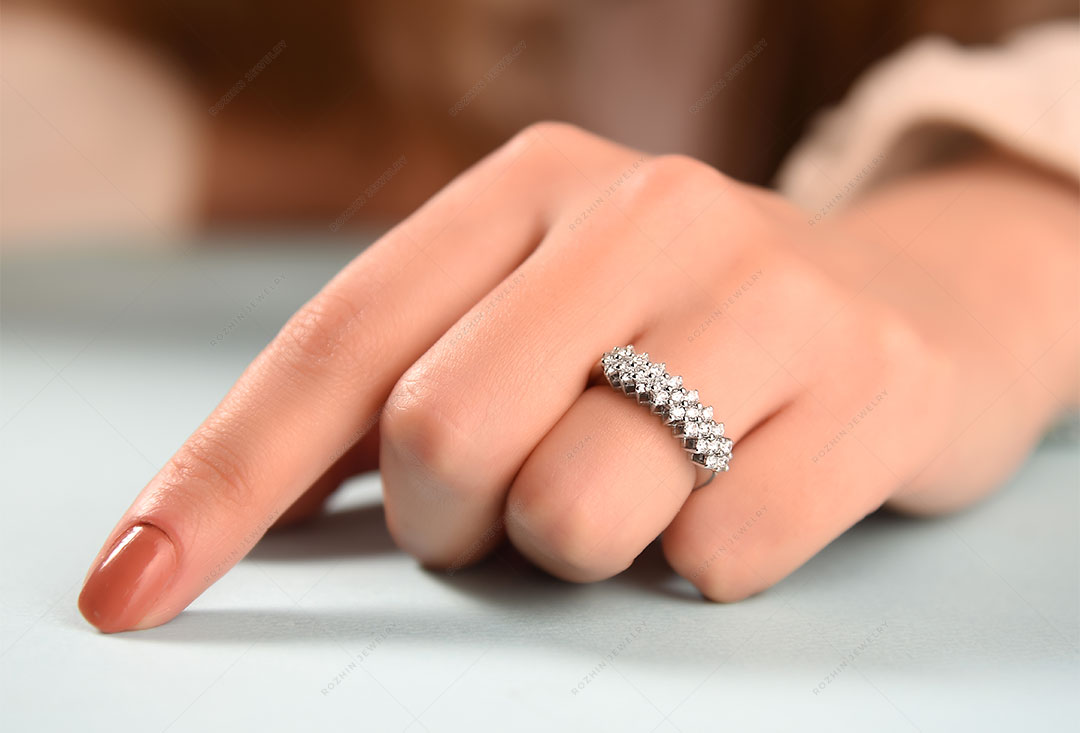 در این محصول سه ردیف الماس پاک و درجه یک با تراش برلیان به کار رفته که نمایی لوکس به انگشتر بخشیده و باعث درخشندگی هرچه بیشتر محصول شده.