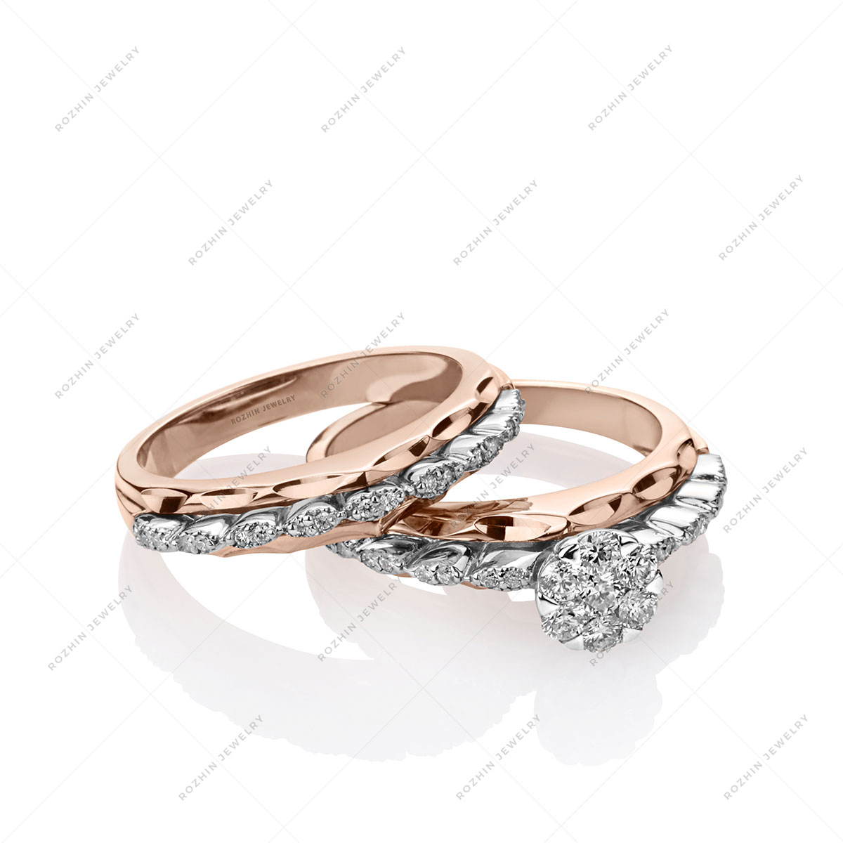 حلقه و پشت حلقه رز گلد و سفید با برلیان پاک و درجه یک