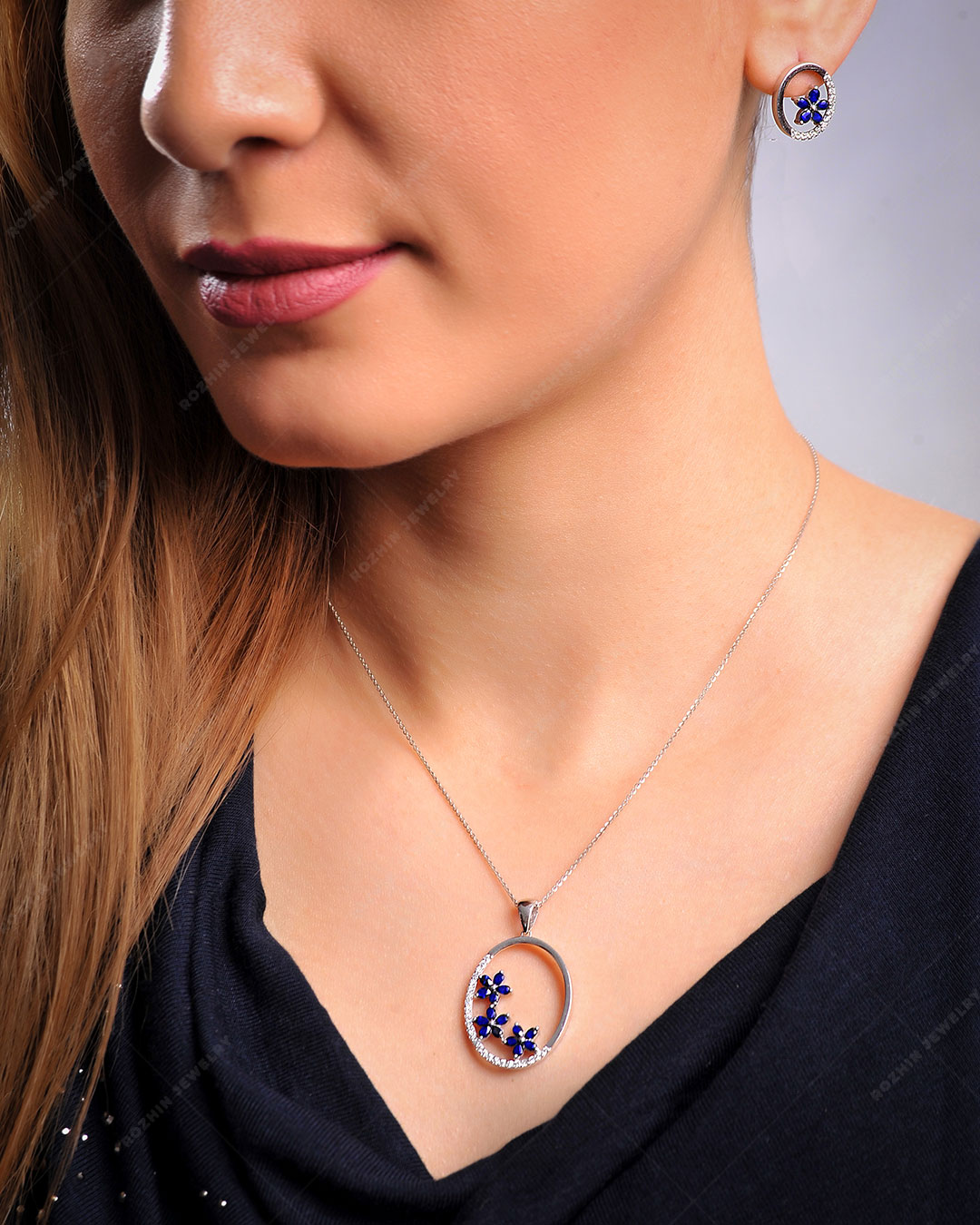 نیم ست جواهر متشکل از سنگ های قیمتی یاقوت کبود و برلیان های پاک و درجه یک. رنگ طلای این نیم ست سفید می باشد.